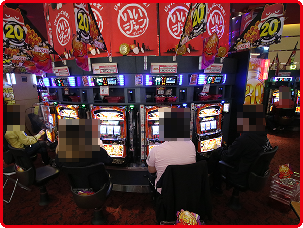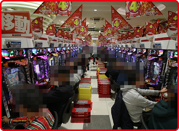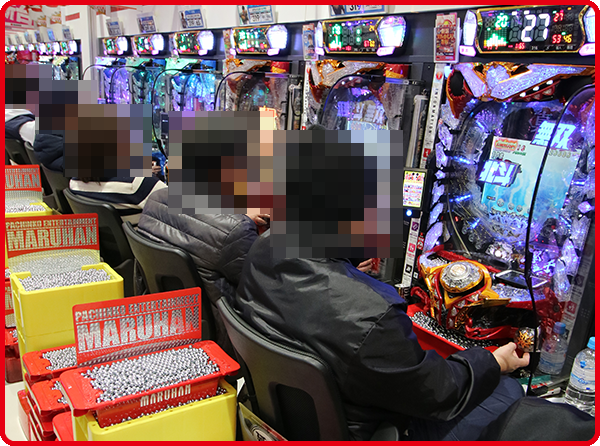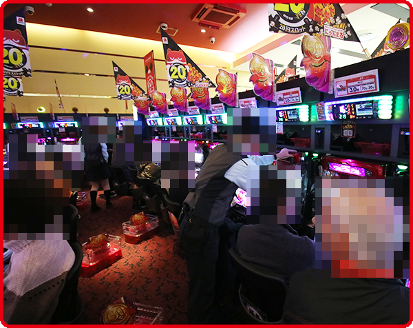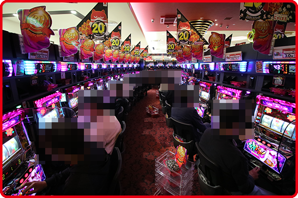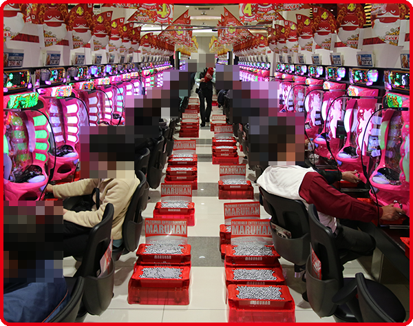 取材時の店内では、パチンコとパチスロの両方が活況。大勢のプレイヤーが楽しそうに過ごしていた。