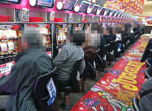 ジャグラーシリーズや「ミリオンゴッド-神々の凱旋-」の支持も厚く、にぎやかな状況。