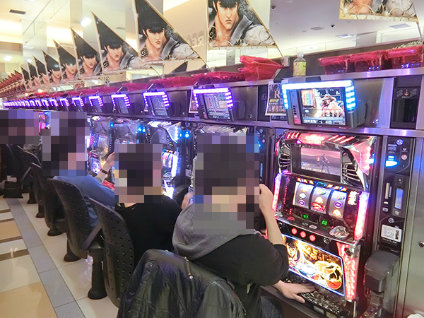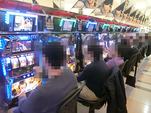 シマの角から中央に向かって輝くような笑顔のプレイヤーがズラリ。空き台がないといった稼働率の高さも印象的であり、シマ内で感じられた雰囲気はにぎやかだ。