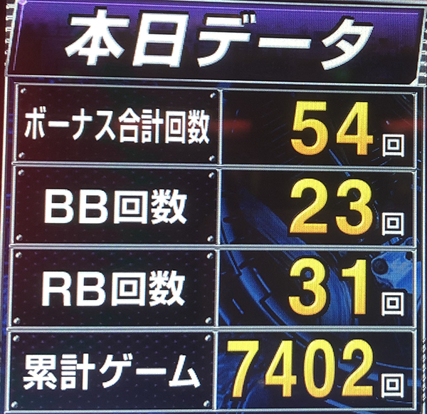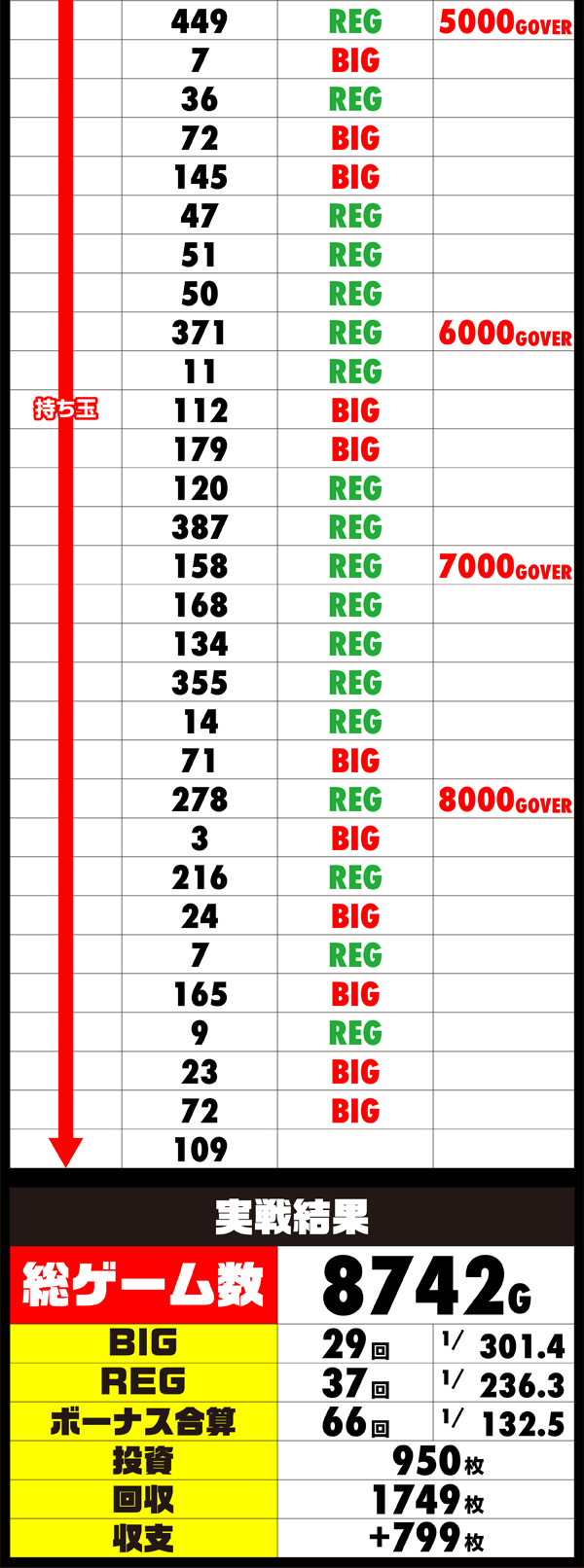 夕方を過ぎた頃からは獲得するボーナスがREGに偏りはじめ、スピードアップができる展開。1時間あたりの消化ペースは800Gに近く、21時頃には7400Gに到達していた。