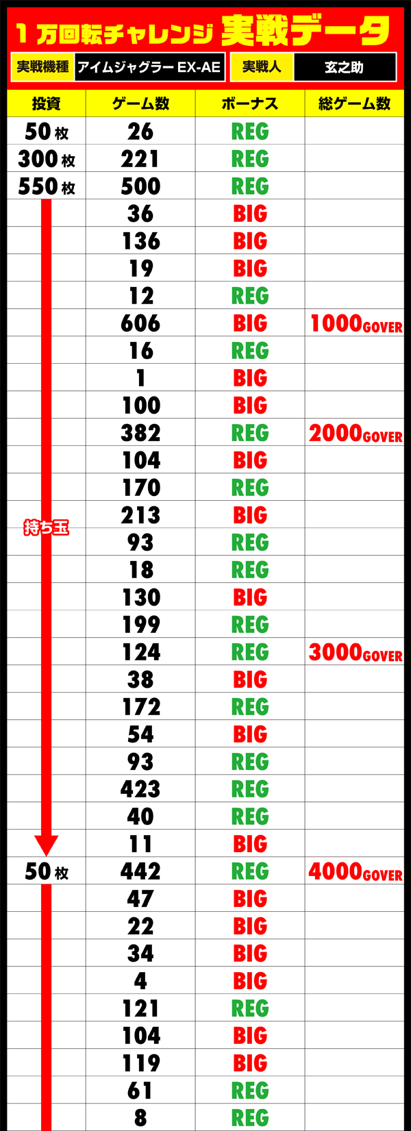 実戦機種には、「アイムジャグラーEX-AE」をチョイス。慌ててレバーを叩きはじめるも、12時までに消化したゲーム数は500Gと、当たり前ながら完全に出遅れてしまった。