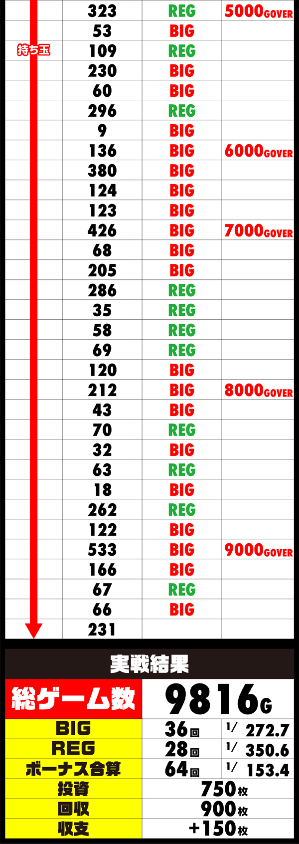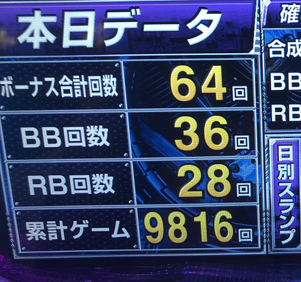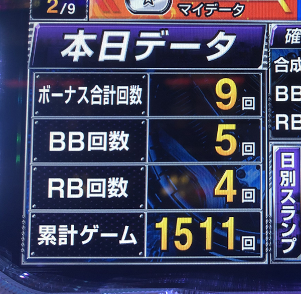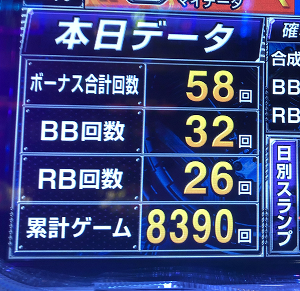 昼前に500G以上のハマリがあったものの、時間とともにボーナス獲得スピードが上がっていき、ゲーム数に関しては序盤から消化ペースが遅かった。出玉面だけでなく、チャレンジでも活躍ができるように頑張ってほしい!