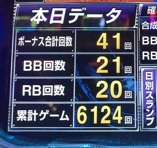 18時の時点では6100Gを消化。BIGとREGをバランス良く獲得しているが、ボーナス回数が純粋に多いために通常時を消化するスピードはなかなか上がらなかった。