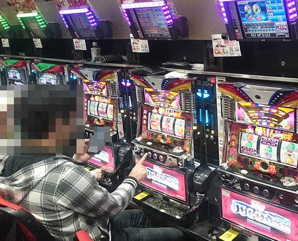 設置されている5台のうち3台が稼働。レバーを叩いてストップボタンを押すといったひとつひとつの行動が軽やかであり、機種のおもしろさを存分に堪能していることも伝わってきた。