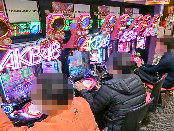 16時ごろの4円パチンコをチェックすると「CRぱちんこ AKB48-3 誇りの丘」や「CRフィーバー戦姫絶唱シンフォギア」でプレイヤーが大活躍。各人の満足気な表情が印象に残っている。