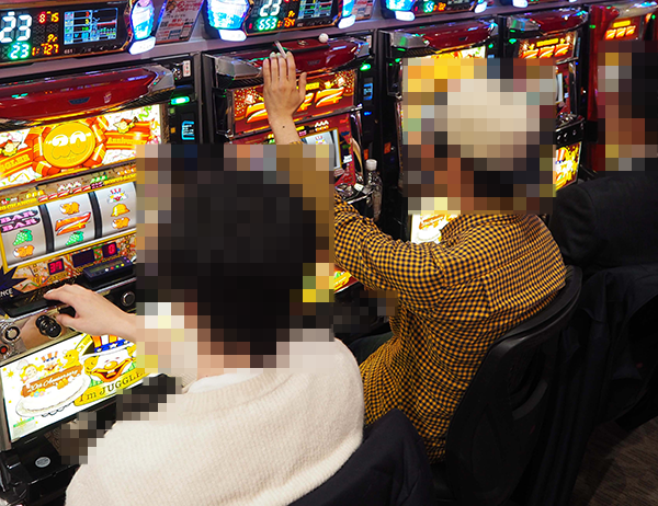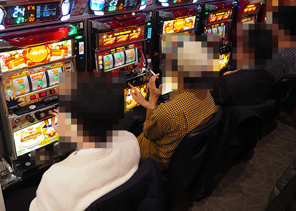 さまざまな機種が楽しまれているパチスロコーナーにおいて、とくに明るい雰囲気が感じられたのはジャグラーシリーズ。機種の魅力を堪能できているようなプレイヤーをあちこちで目にしている。