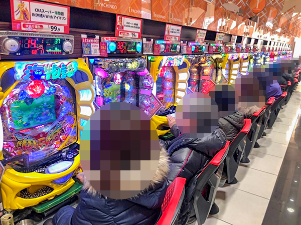 取材時は既に多くのプレイヤーであふれており、パチンコ・パチスロを問わず楽しげな表情でいっぱいだった。