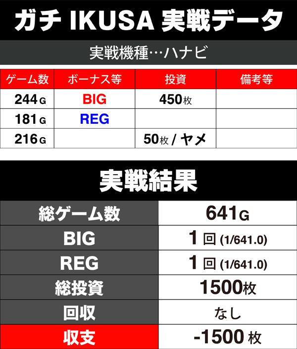 「パチスロ北斗の拳 強敵」と同様に前日に手応えを感じられていた「ハナビ」で実戦を再開したのだが、結局、お小遣いをすべて使いきってしまい実戦を終了…。