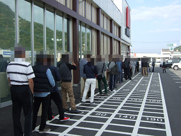 この日の入場抽選にもたくさんのプレイヤーが集まっており、開店時間になると一般入場を含めて80名もの人数が入店していった。