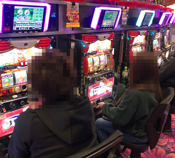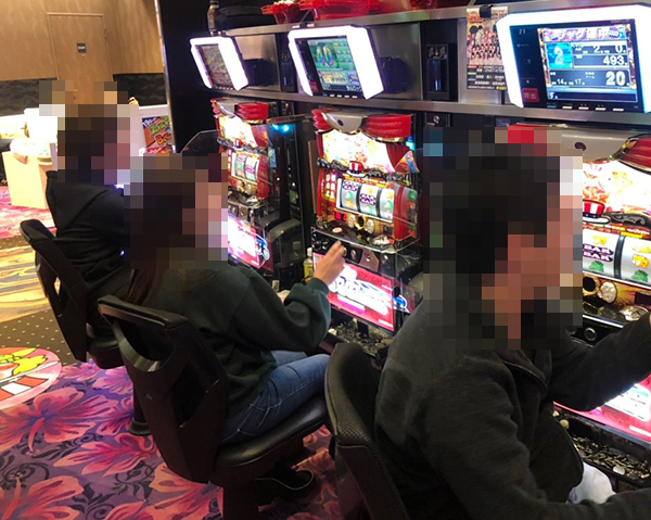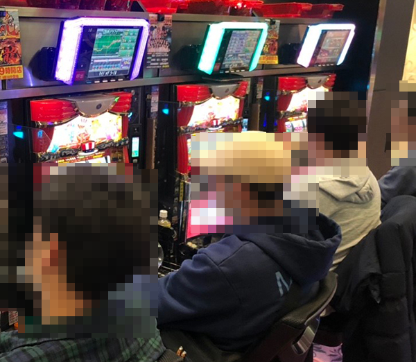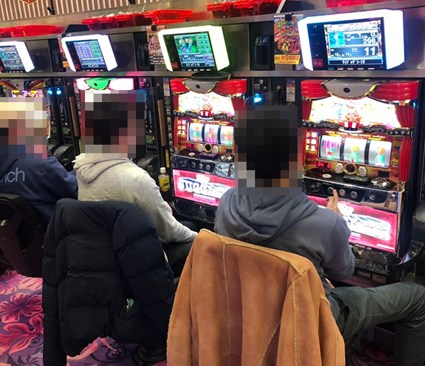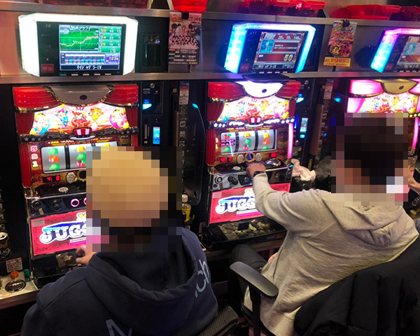 3台ずつが背中合わせに設置されており、どちらも盛り上がりが大きい。満面の笑みを浮かべながらレバーを叩いているプレイヤーがみられ、機種のおもしろさを存分に堪能していることも伝わってきた。