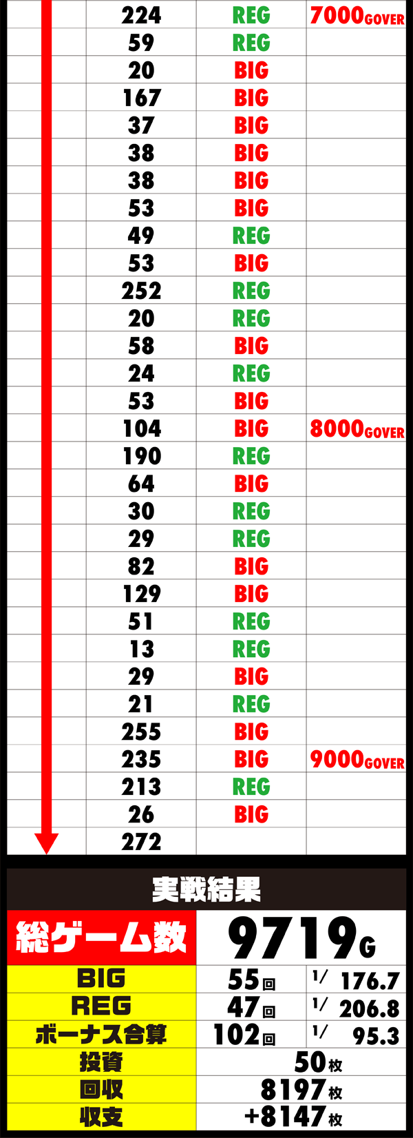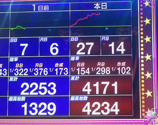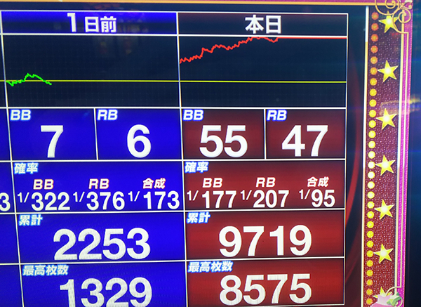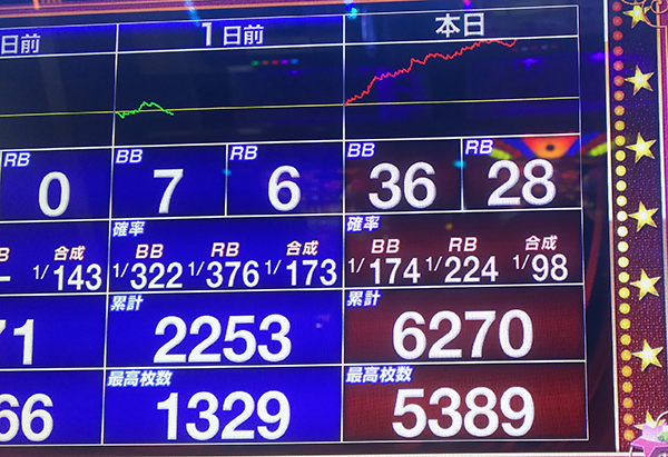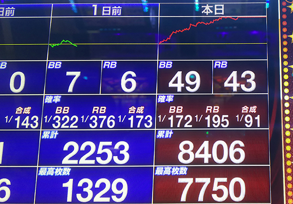 朝から続いている高設定といったボーナス合算確率は、終盤になっても変わらない。最終的には100回以上のボーナスを獲得と、なかなかお目にかかれない大記録までつくっていた。