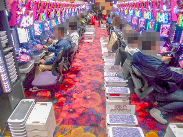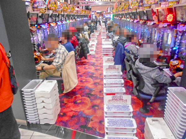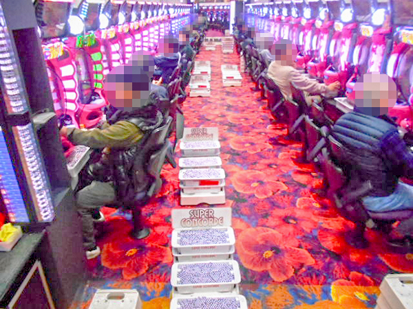 店内には老若男女を問わずプレイヤーが集まっており、パチンコ・パチスロの各シマが明るい雰囲気に包まれていた。