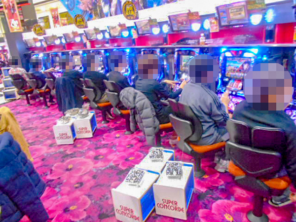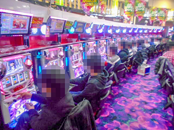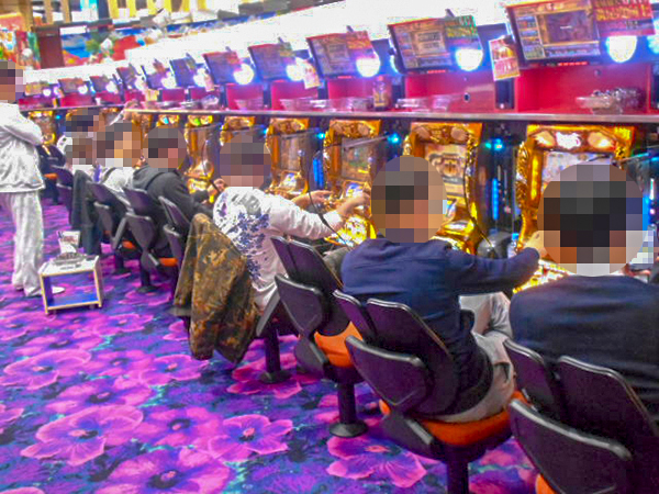 1000円/190枚パチスロの稼働も高い。楽しそうにレバーを叩くプレイヤーの姿を複数目撃している。