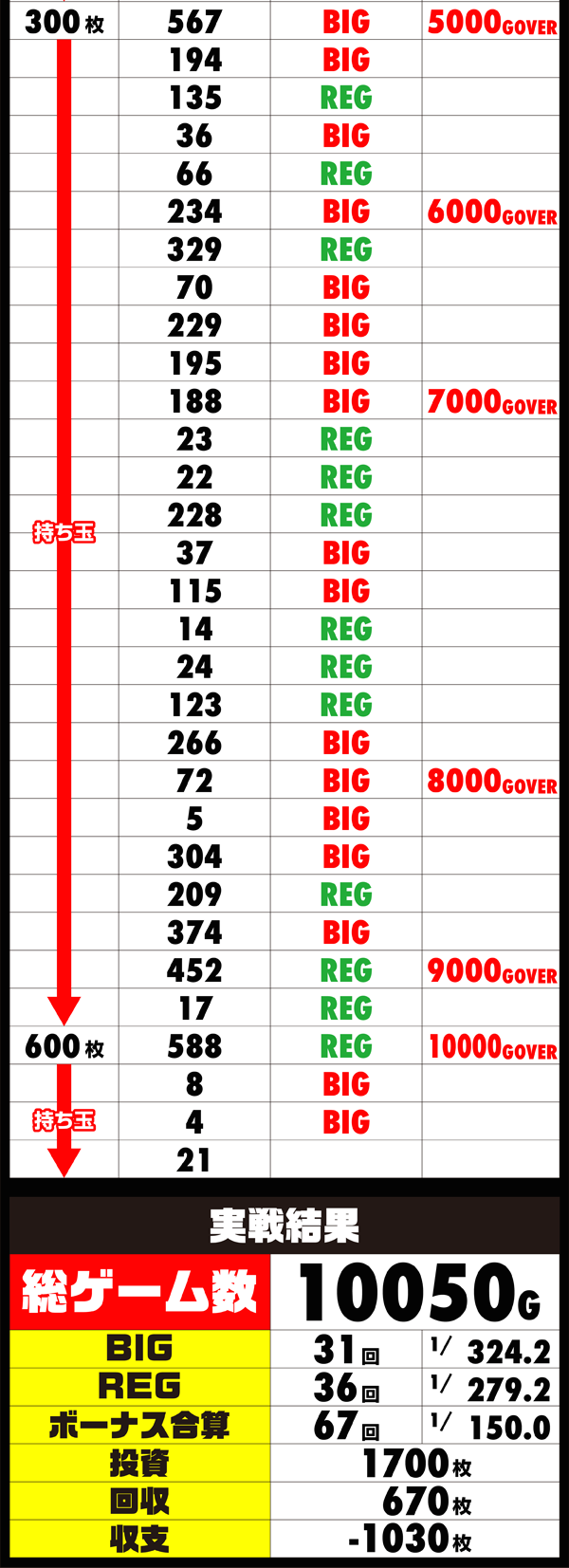 終盤にかけて通常時を消化するペースは落ちていったものの、21時頃には8600Gを突破。適度なハマリでラストスパートをかけながら、ゴールに向かって全力で走り続けた結果は…。