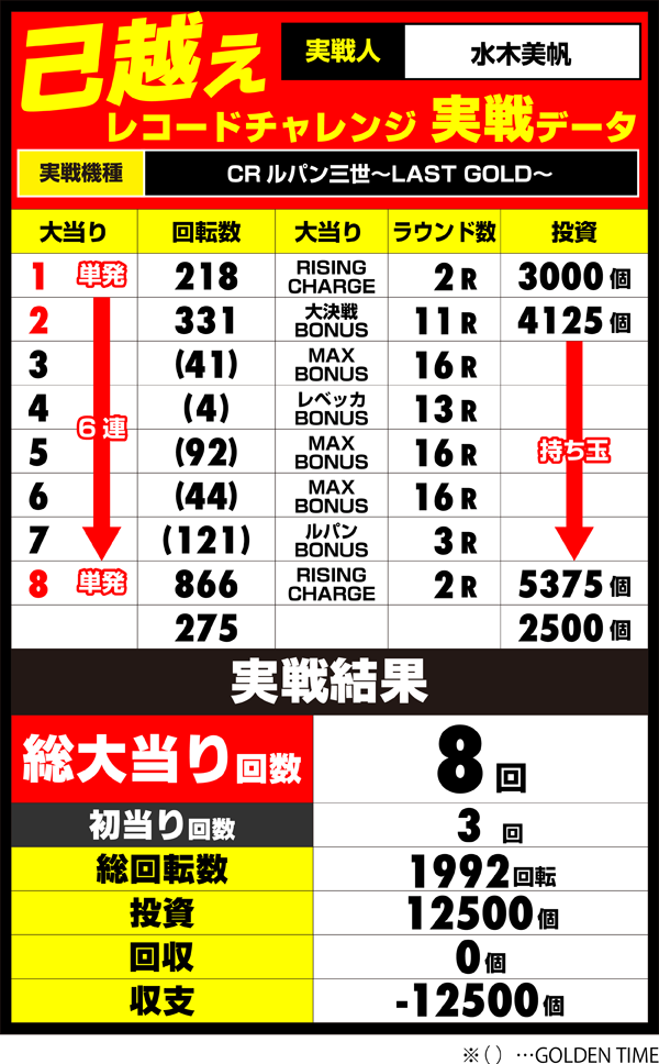 調子がよかったのは最初だけで、後半はヒキの弱さが目立つといった残念な結果でチャレンジは大失敗。