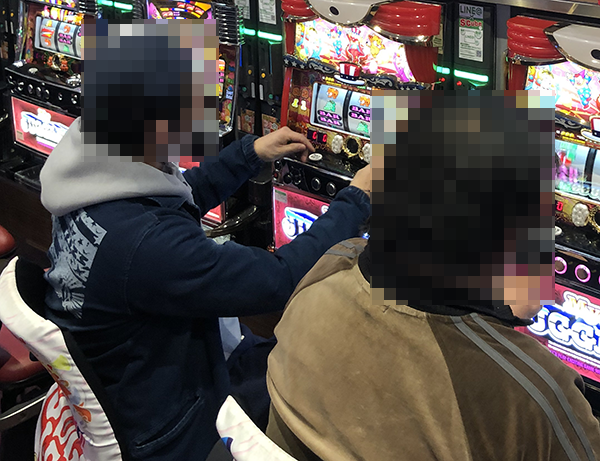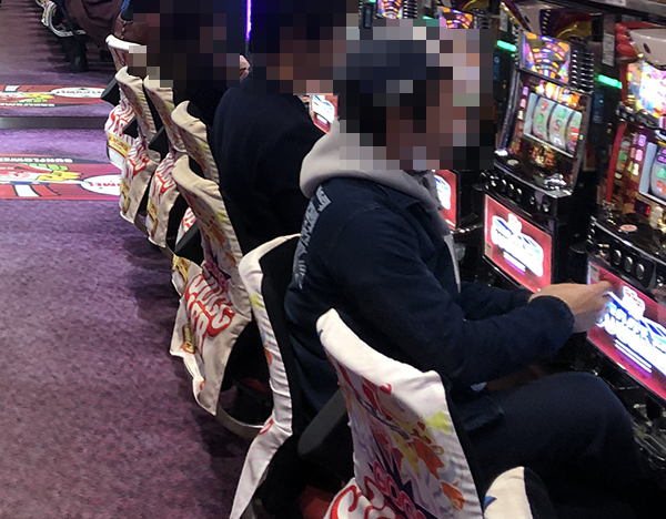 背中合わせで遊技をおこなっているプレイヤーのひとりひとりに目を向けると、全員が機種の魅力を味わえている様子。
