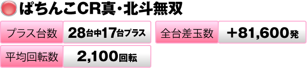 ホールの看板機種として、根強い人気を誇る『ぱちんこCR真・北斗無双』は、28台中17台がプラスというさすがの安定度と出玉力で、全台差玉数は+81,600発を計上。