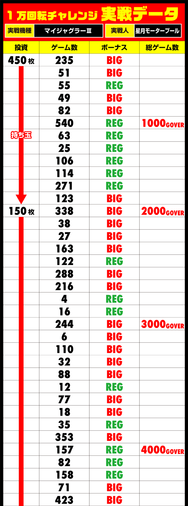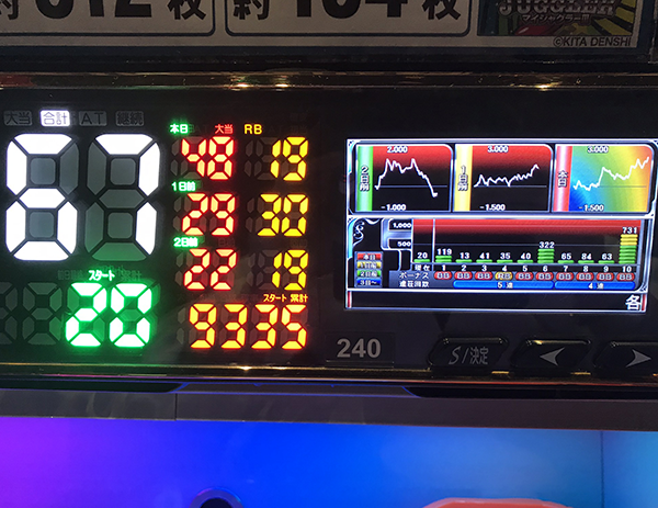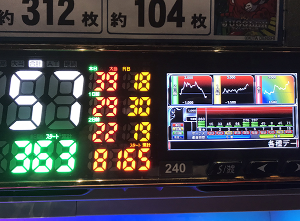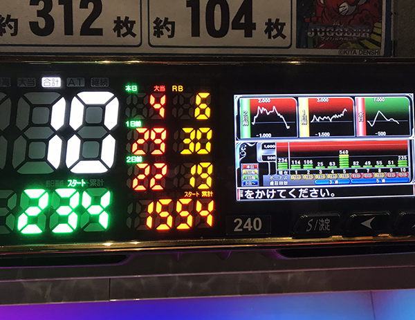 中盤からはBIGの回数が伸び、通常時を消化するペースは少し遅れてしまう。18時頃のデータカウンターの表示は6000Gであるが、レバーを叩くスピードを上げれば、まだ挽回ができる状況なだけに、あきらめずに頑張ってほしい。