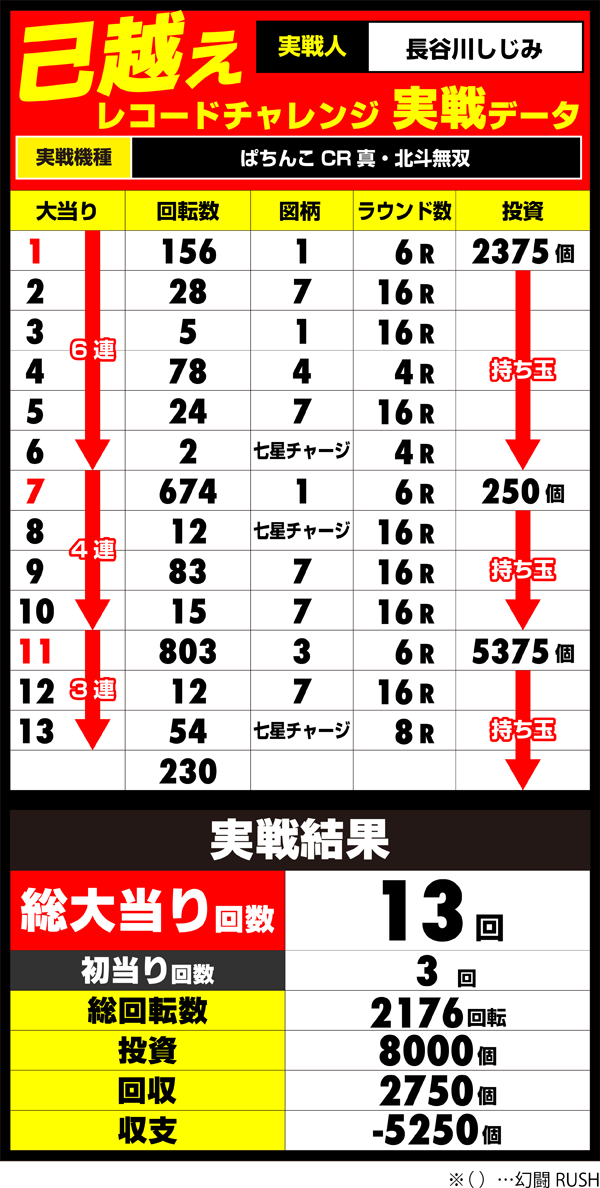803回転目で3回目の初当りを獲得するも、連チャンを3回しか伸ばせず、折り返し地点にすら届かずにチャレンジは終了となった。
