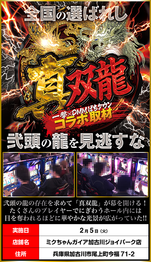 パチンコとパチスロをあわせて1000台以上の遊技台が設置されている「ミクちゃんガイア加古川ジョイパーク店」を舞台に「真双龍」を敢行。
