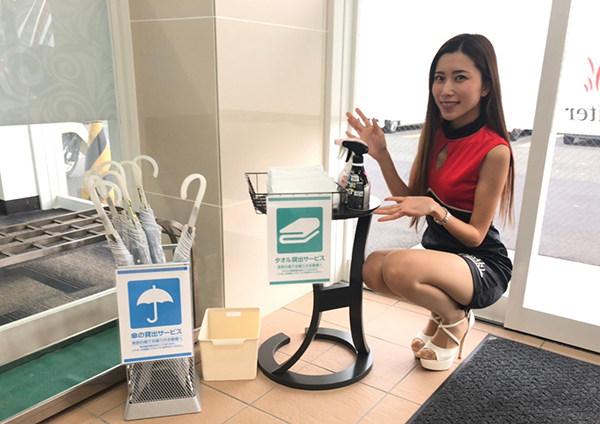 ホールの入り口には、貸し出し用の傘やタオルが用意されている。天候にあわせたサービスからも、プレイヤーへの思いやりが伝わってきた。