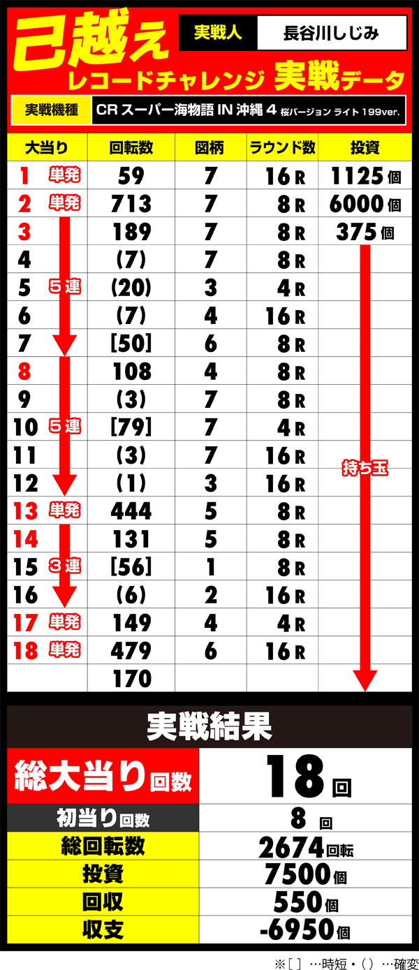 5回目の初当りは単発、6回目は3連チャンと、終盤にも大幅な前進はナシ。