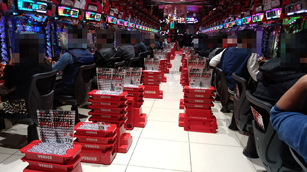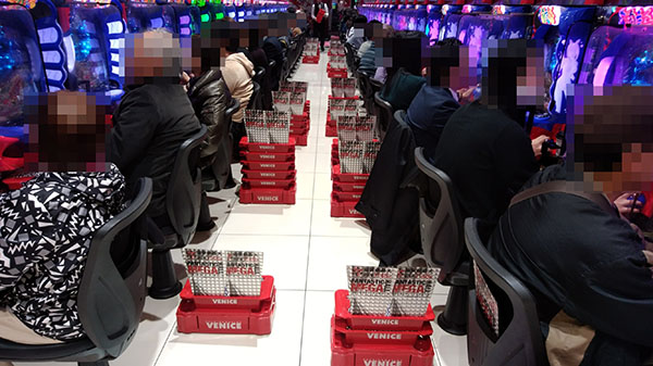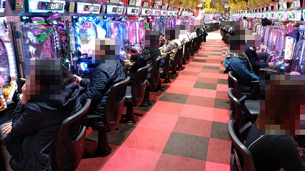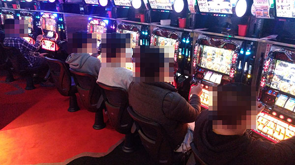 豊富なラインナップが魅力の5円パチスロも、同様に空き台が少ない。各人、自分に合った機種を見つけ出し、遊技を楽しんでいるようだった。