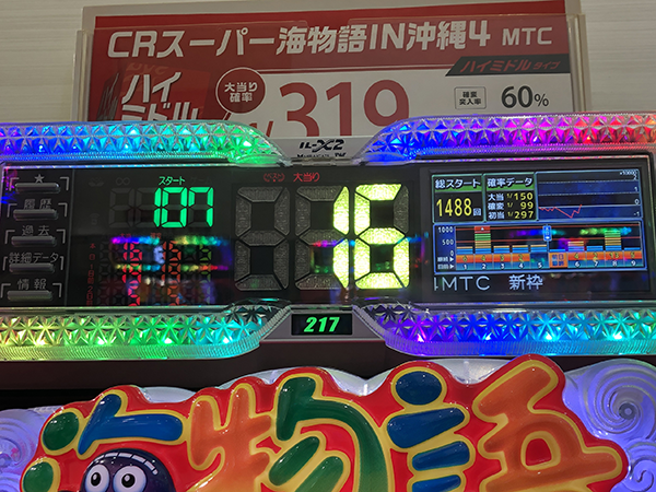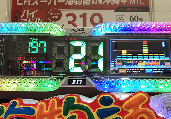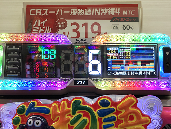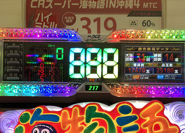 「CRスーパー海物語IN沖縄4」の過去最高大当り31回を目指して打ちはじめると、217回転目で1回目の初当りを獲得するも単発。
