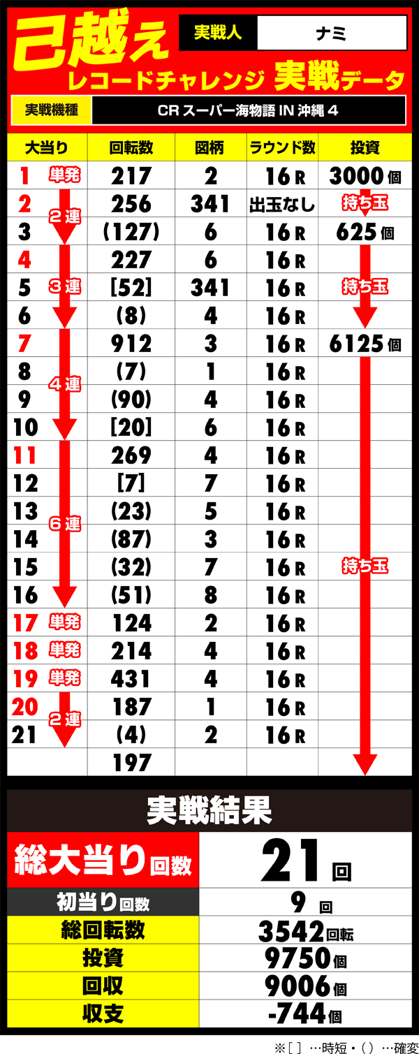9回目の初当りで2連チャンするも、目標とする32回には届かずにチャレンジは終了となった。