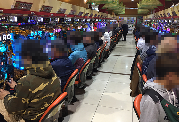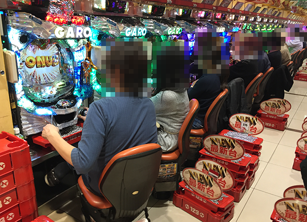 14時を過ぎた頃の4円パチンコで1番の盛り上がりをみせていたのは、新台の「CRA牙狼金色になれ〜ザルバとの契約〜」。