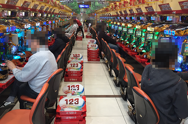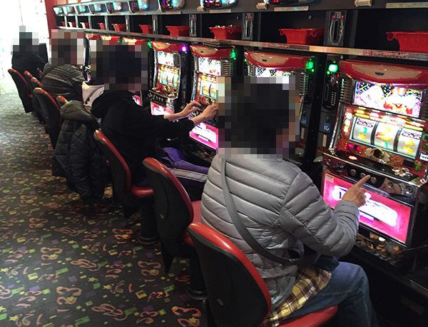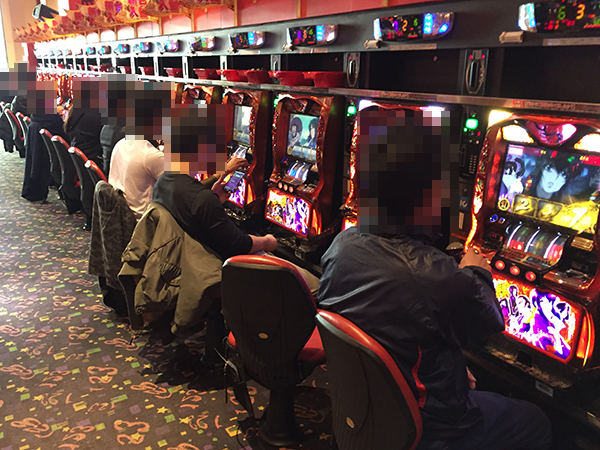 たくさん遊べる5円パチスロのたくさんのプレイヤーで大にぎわい。