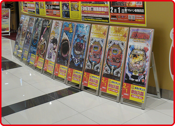 取材日は新台入れ替え当日。機種名や台番号が書かれた看板がズラリと並んでいるスペースもあるなど、みためにもわかりやすく紹介されていた。