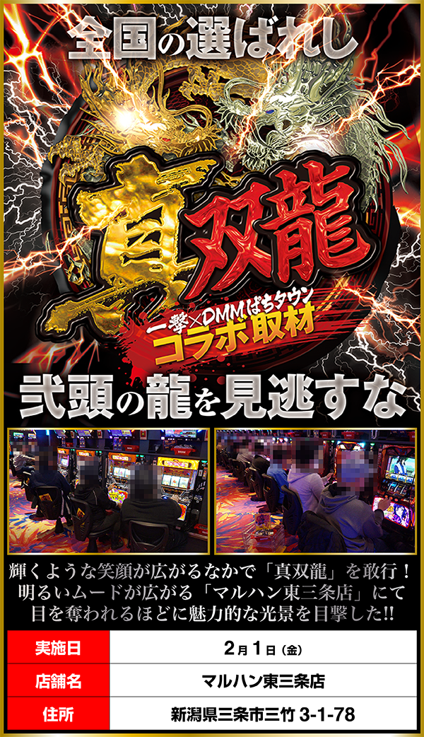 天井が高く、通路や台間の広い開放的な空間が広がる「マルハン東三条店」を舞台に「真双龍」を敢行。