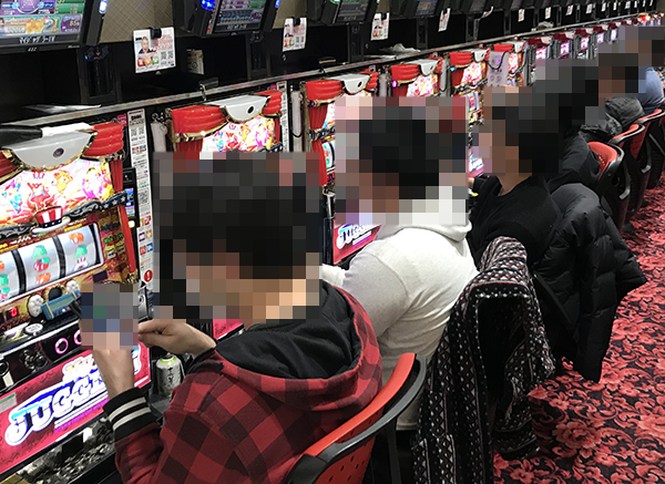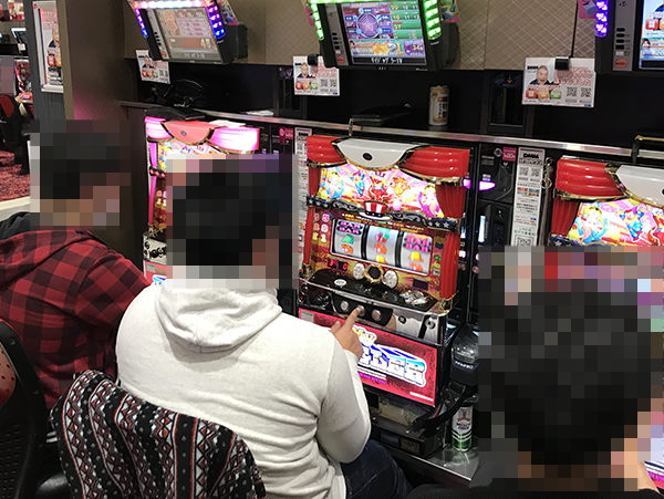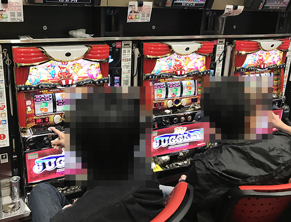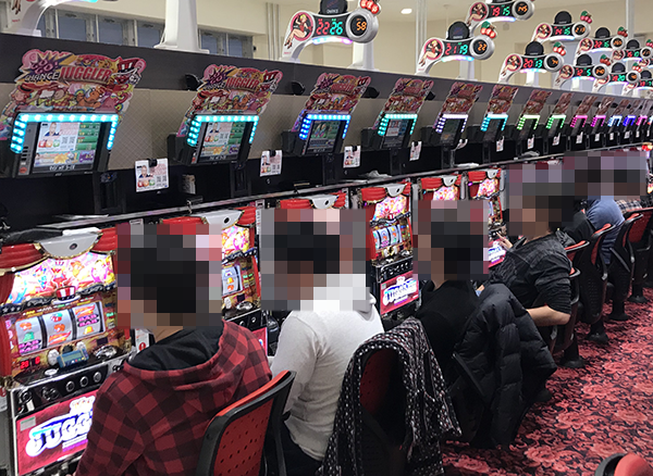 ジャグラーシリーズが集められているシマに6台設置されており、フル稼働。さまざまなシリーズ機のなかでもっとも支持が厚いことにくわえ、パフォーマンスを披露するプレイヤーも多かった。