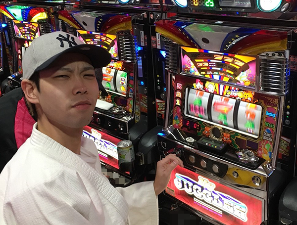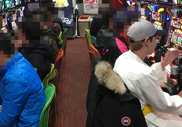 入店後は朝イチから満席となるほどに人気を集めている「マイジャグラーⅢ」を実戦機種にチョイス。カメラに向かって真剣な表情をみせるなど、気合いは十分なようだ。