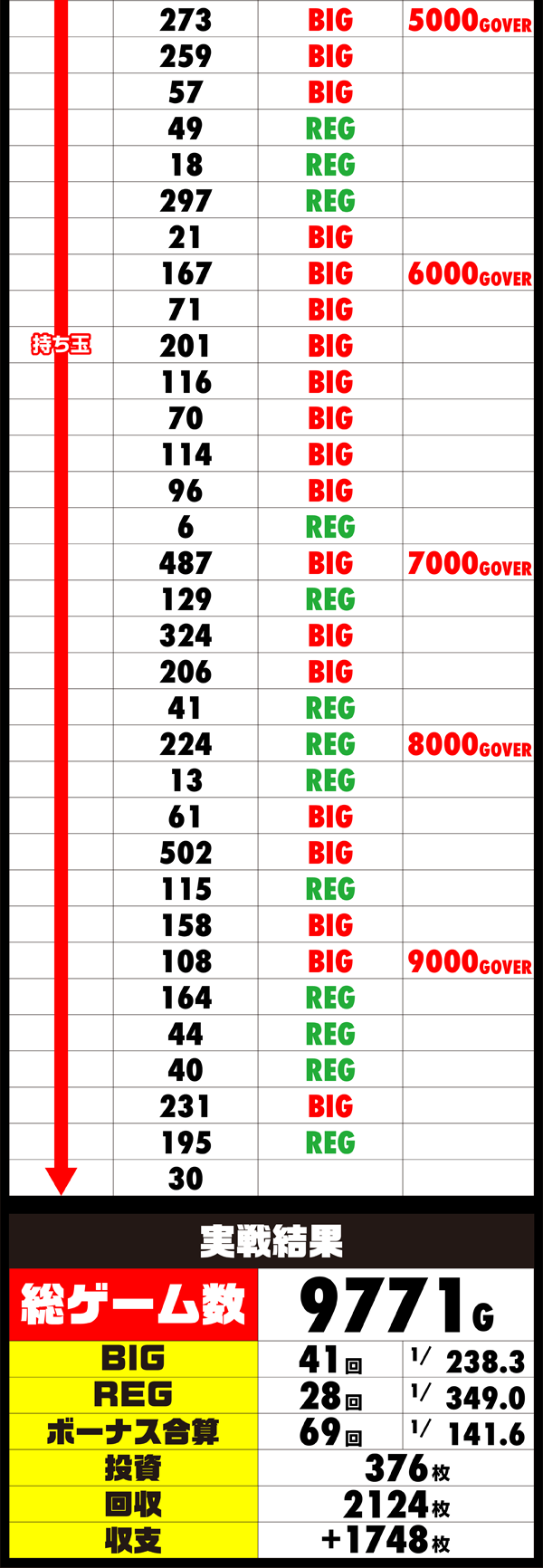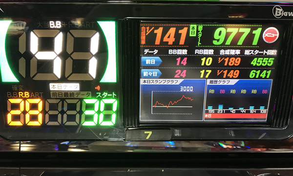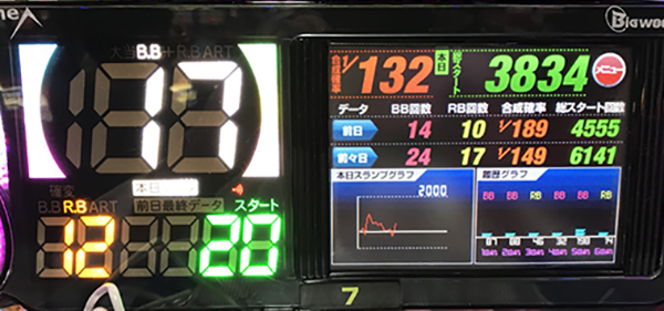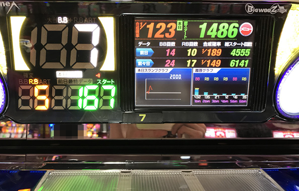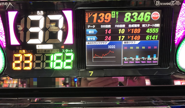 1400Gまでに獲得した12回のボーナスのうち、7回がBIG。微妙なハマリがあり、追加投資をするシーンがあったものの、3800Gの時点で17回のBIGをゲットしていた。
