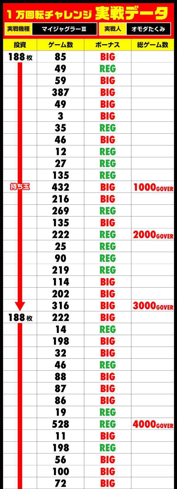 このホールでは何回も1万回転チャレンジをおこなっているが、目標を達成できたのはたったの2回。