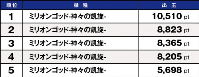 特に『ミリオンゴッド-神々の凱旋-』では万ptオーバーを始め8千pt超が実に3台と、前述の絶対エースをも上回る怪記録を量産した。
