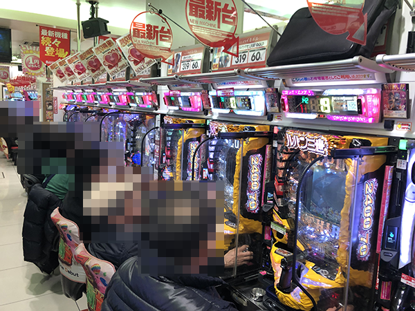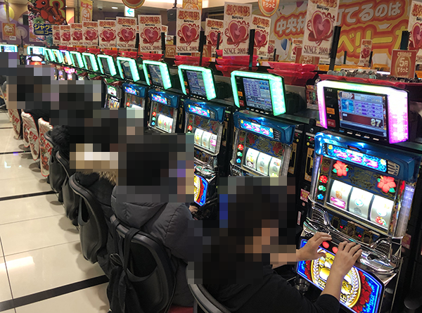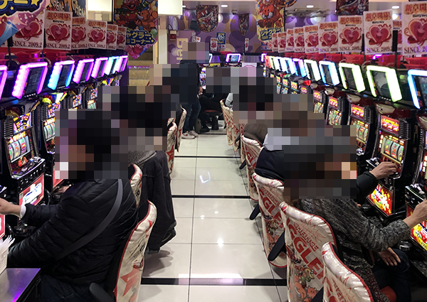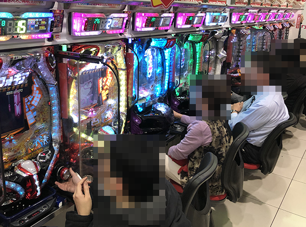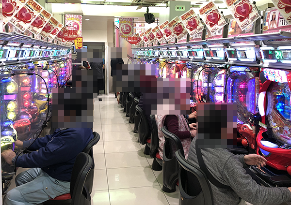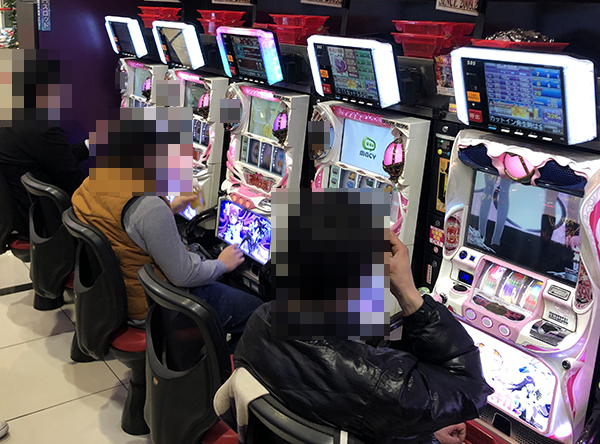 取材の1日目となる21日の店内をみわたすと、パチンコとパチスロの両方が活気づいていた。