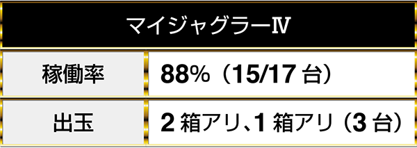 なかでも、ひときわ盛り上がっていたのが『マイジャグラーⅣ』。17台中15台が稼働しており、4名以上のプレイヤーが1箱を超える出玉を獲得していた。