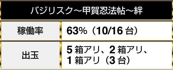 確認時には『バジリスク~甲賀忍法帖~絆』で5箱以上の出玉を獲得している姿を目にしている。