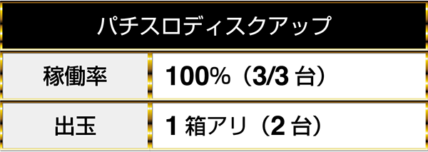 3台が並んで設置されている『パチスロディスクアップ』は満席。確認時は3名中2名のプレイヤーが持ち玉で遊技を楽しんでおり、にぎやかな雰囲気が感じられた。