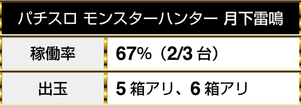 フル稼働にはなっていないものの、『パチスロ モンスターハンター 月下雷鳴』も大盛況。