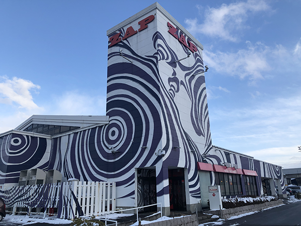 紫色の渦巻き模様が特徴的といった外観であり、高い場所に掲げられているホールの文字は遠くからでも目につきやすいと思えた。