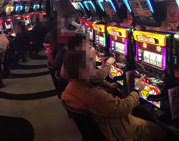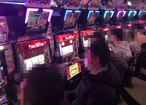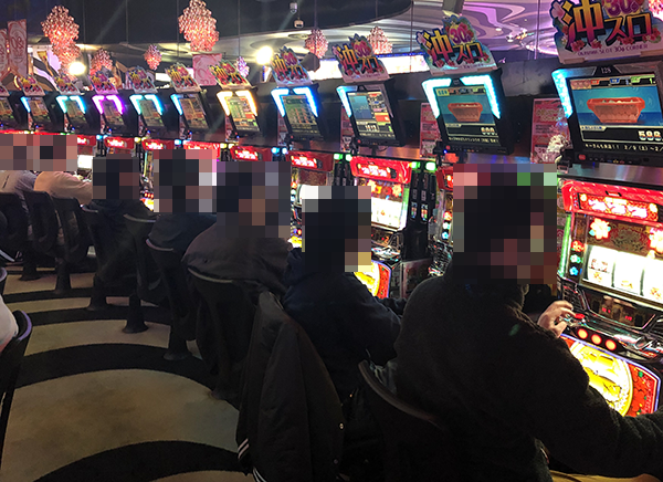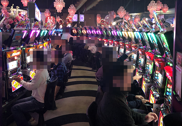合計28台が背中合わせで設置されており、ほぼすべての台が稼働。機種のポテンシャルを引き出すといったプレイヤーがシマの端から端まで並んでいる光景は壮観だ。