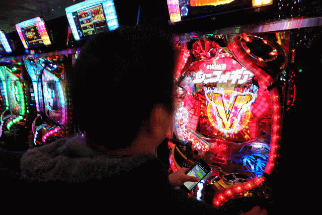 入場するや一心不乱に狙い台を目指すファン、台を見事確保し上気するファンと興奮が渦巻く。