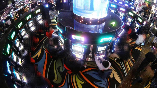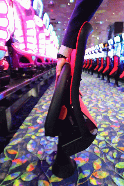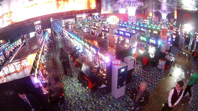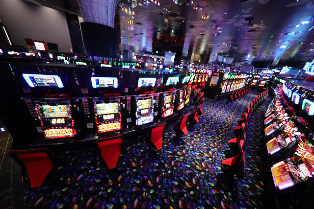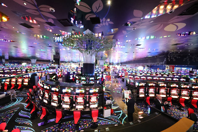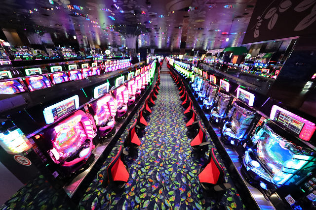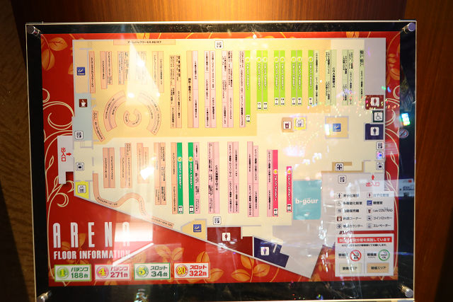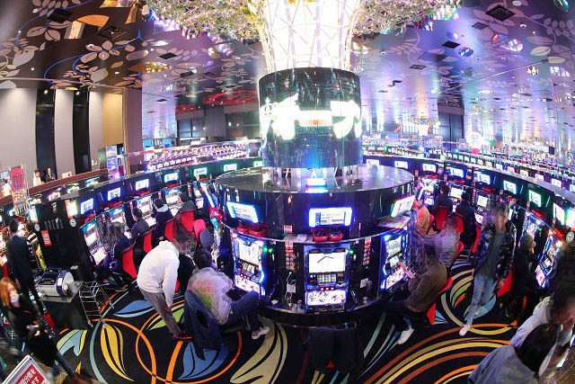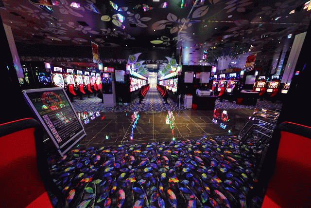 パチスロエリアは、円を描くようなレイアウトで遊び心をくすぐる。クリックすると、俯瞰で確認出来ます