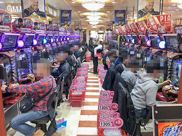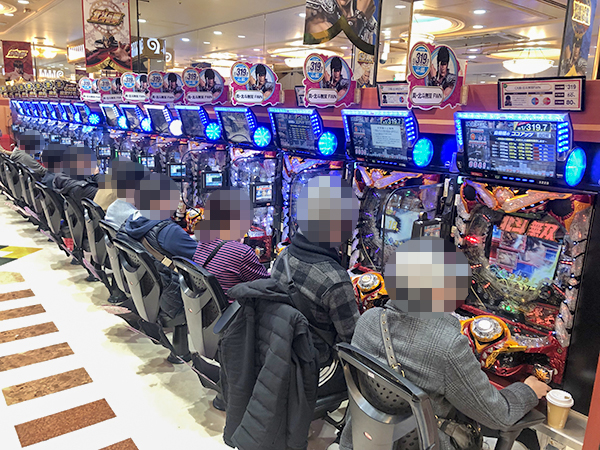 開店直後は4円パチンコの「ぱちんこCR真・北斗無双」が人気で、次々と席が埋まっていた。