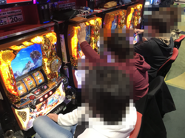 機種やスペックを問わずに、明るい笑みを浮かべながら遊技をおこなっている姿も確認。なかでも印象に残っているのは、前回の「真双龍」のときにも華やかな光景が広がっていた「パチスロ 聖闘士星矢 海皇覚醒Special」の大きな盛り上がりだ。