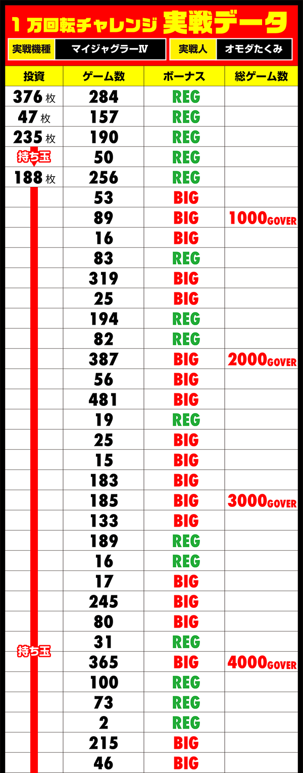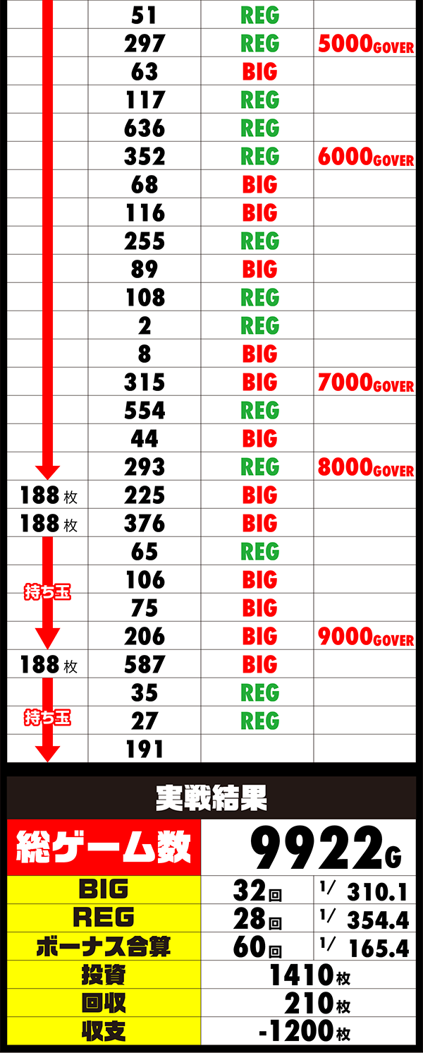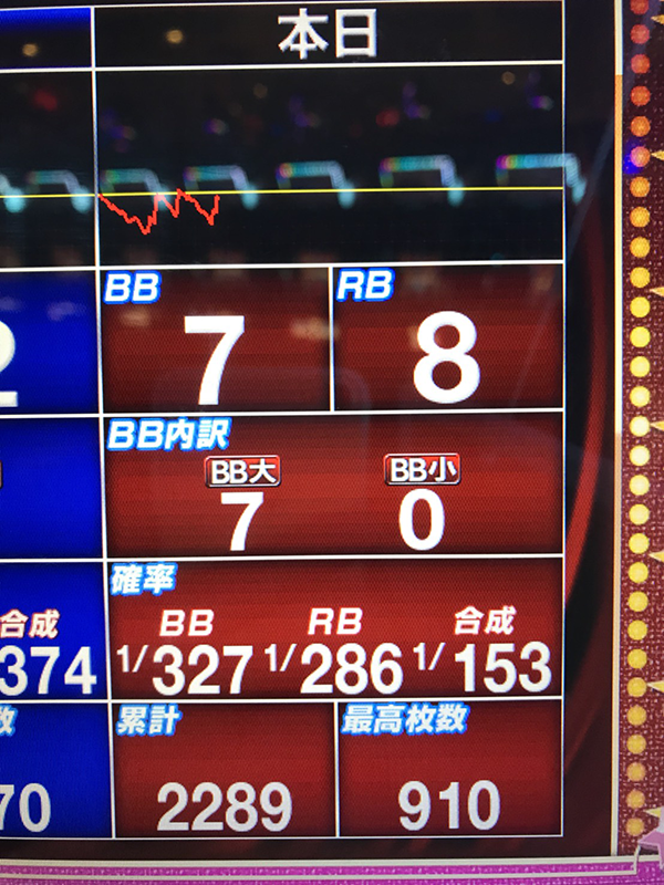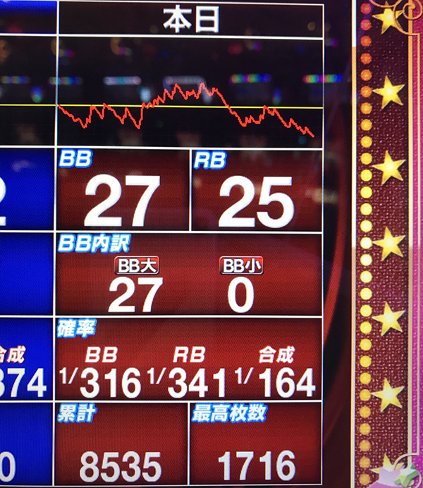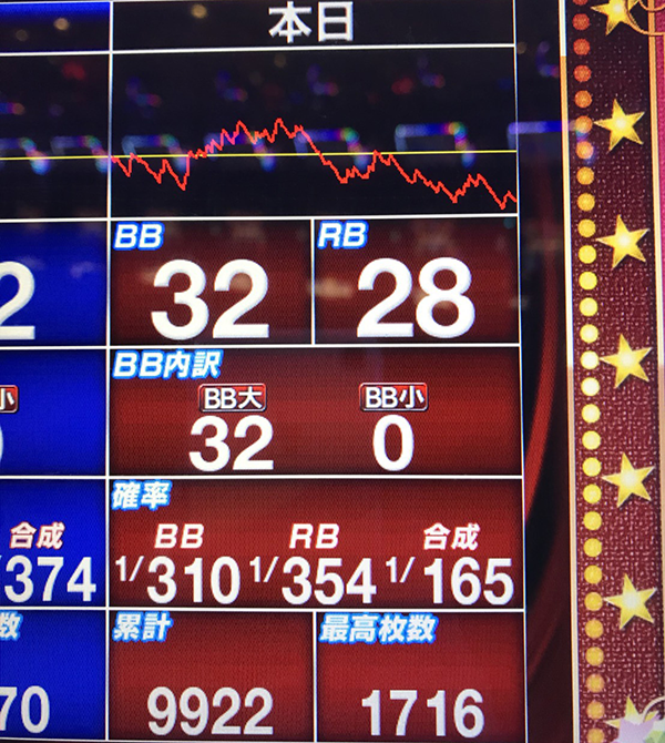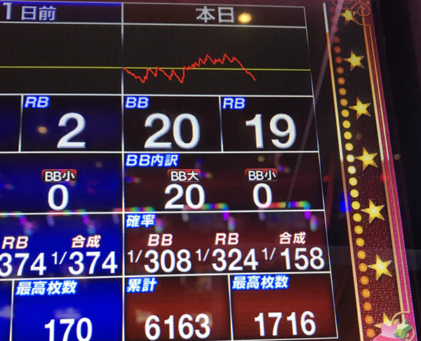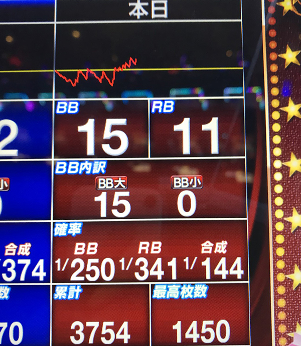 時間の経過とともにBIGにも恵まれ、13時にはBIG7回、REG8回とバランスのよいデータを刻んでいくあたりはさすが。